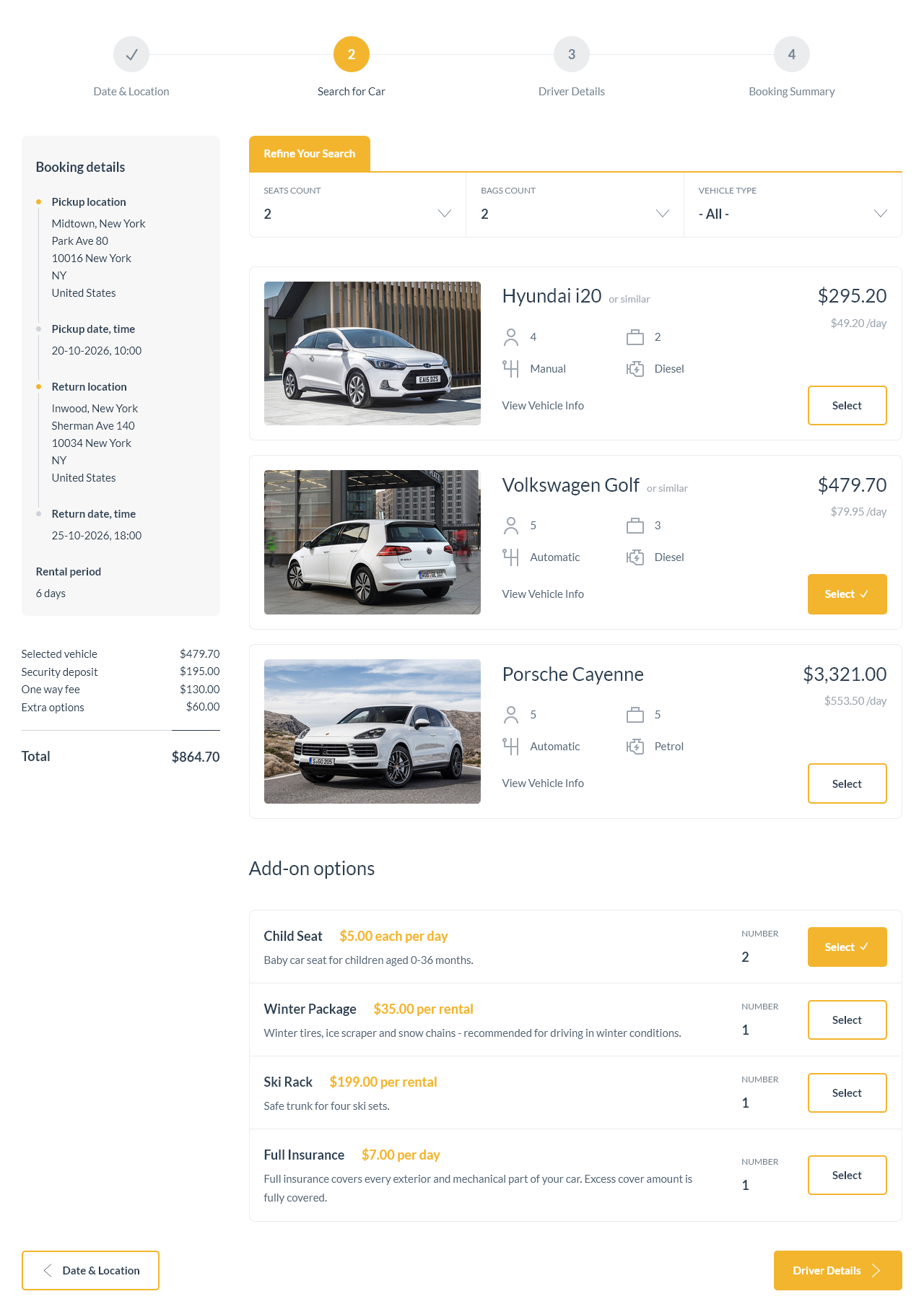 The vehicle list has been redesigned to be more compact and better organized, allowing customers to compare available cars more easily without feeling overwhelmed. Key information is now grouped more clearly, helping users scan options faster and focus on what really matters when choosing a vehicle.